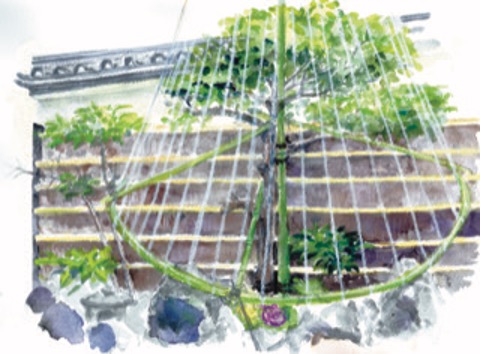 春は、やはり桜です。ツボミで植え入れていただき、落花まで楽しんでいただきます。夏は、あじさいです。雨が降ると、より風情が感じられ、つくばいに落ちる雨粒が動きを創り出します。秋は、紅葉。庭の上の小さな空から陽が射し込みますと、店内にまで秋の情趣に染まります。そして冬は、雪吊り。東京で雪が積もるほど降ることはなかなかありませんが、放射状に縄を張る雪吊りの見事な造形には毎年、私も思わず見とれてしまいます。