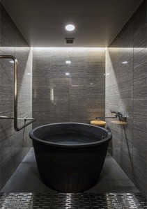 信楽焼の陶製です。たっぷり湯を張ったこの湯舟につかると、身体が包み込まれるようで、とてもリラックスできると評判がいいんです。 It’s made out of Shigaraki clay. When you lie in the bathtub filled with hot water, you can completely immerse yourself in it, so our guests love how relaxing it is. |
